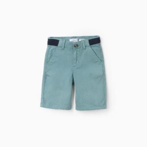 Turquoise twill shorts for boys, in cotton with a touch of stretch for greater comfort and freedom of movement. Medium length. Contrast waist in dark blue, adjustable inside with elastics and buttons. Four pockets. Garment dyed. A wardrobe classic! Big Me: fastens with a snap button under a decorative button up to size 8/9, to facilitate dressing and promote your child's autonomy.