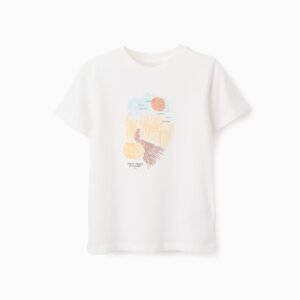 White t-shirt for boys, 100% cotton, with front print. Ribbed collar for easy dressing. Printed inner label to avoid skin irritation. Ideal for everyday looks.