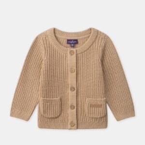Soft knitted cardigan with full button opening. Two pockets with leather-like patches, classic and elegant style.