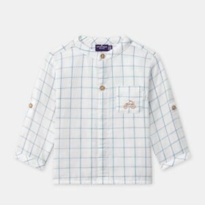 Lightweight cotton shirt with a Mao collar and button opening. Light blue check and a pocket with bicycle embroidery, refined and charming style.