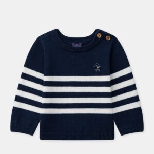 Soft cotton sweater with button opening at the collar. Navy stripes and dog embroidery on the chest, classic and fun style.