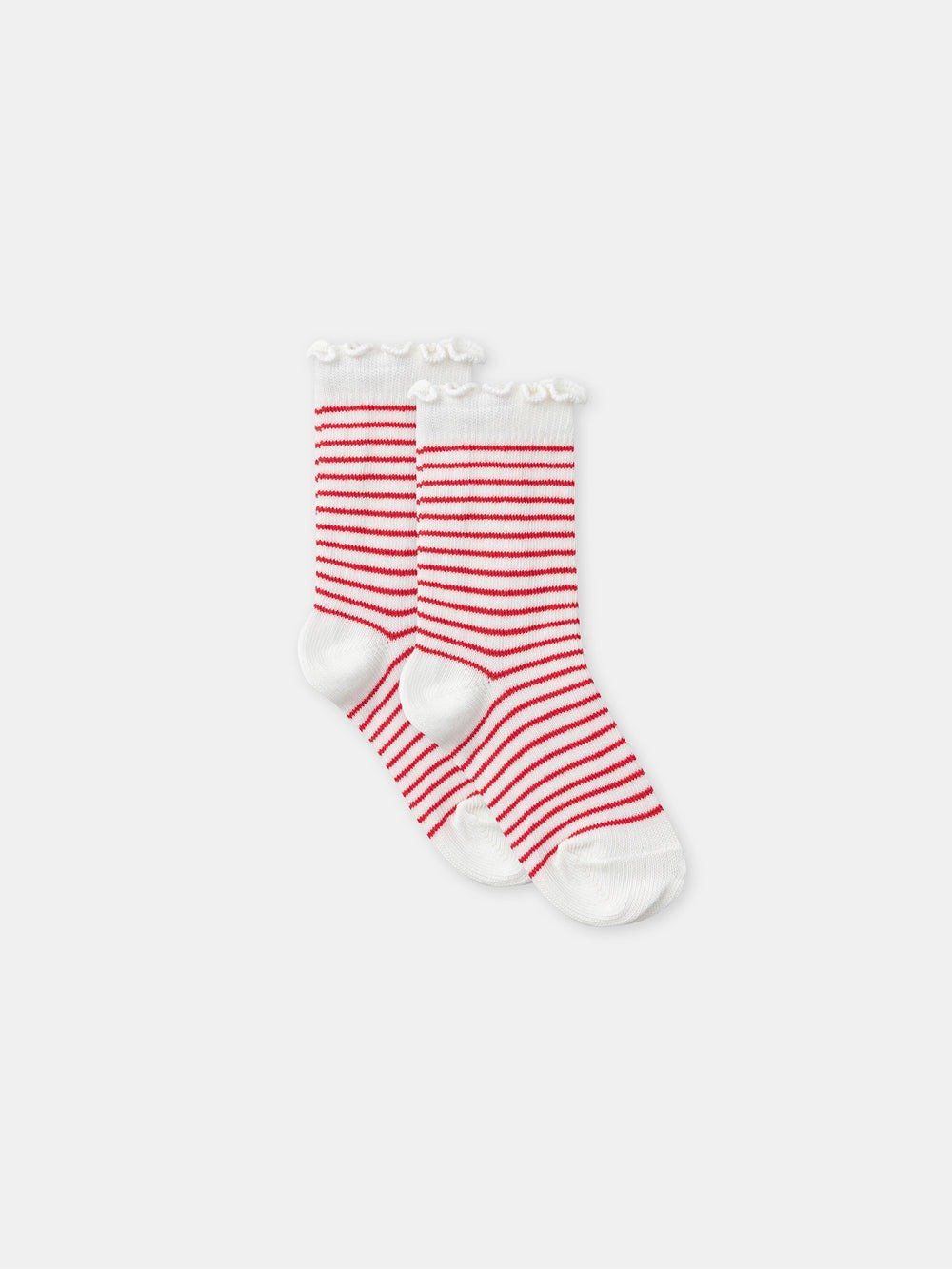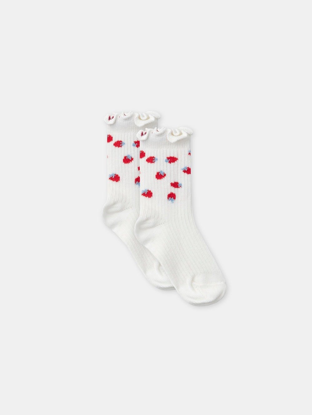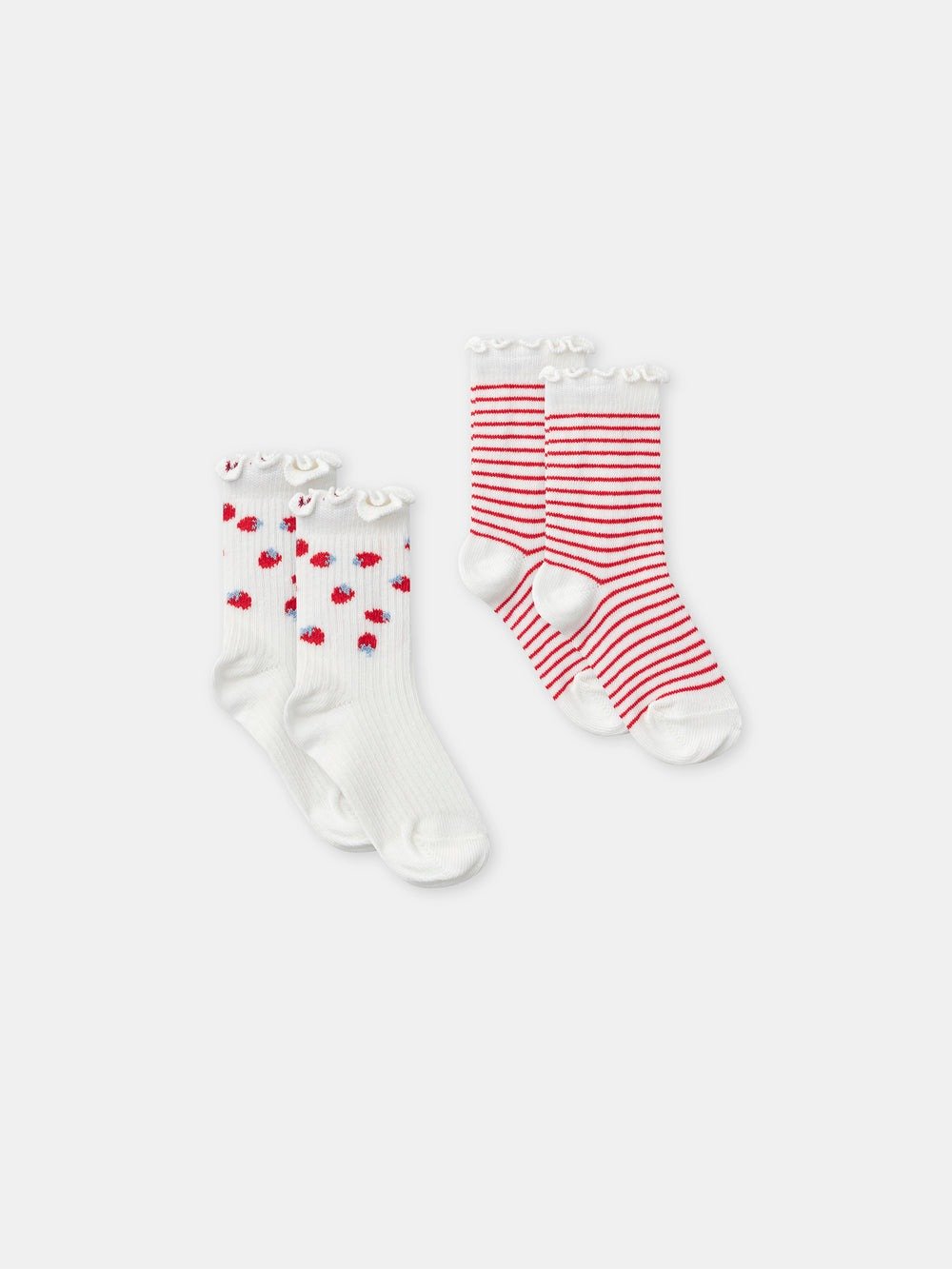 For little mischievous girls, perfect for spring. Soft ribbed cotton socks, set of two pairs. Strawberry patterns and fine red stripes, playful and charming style.