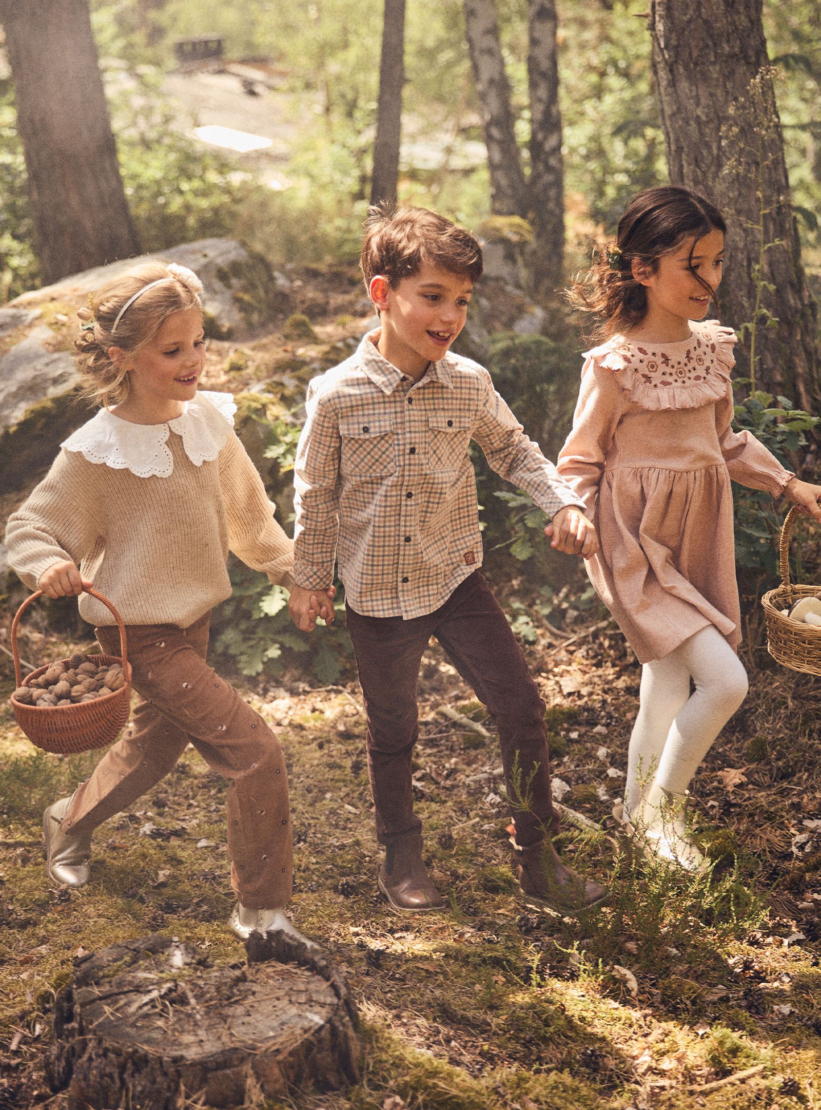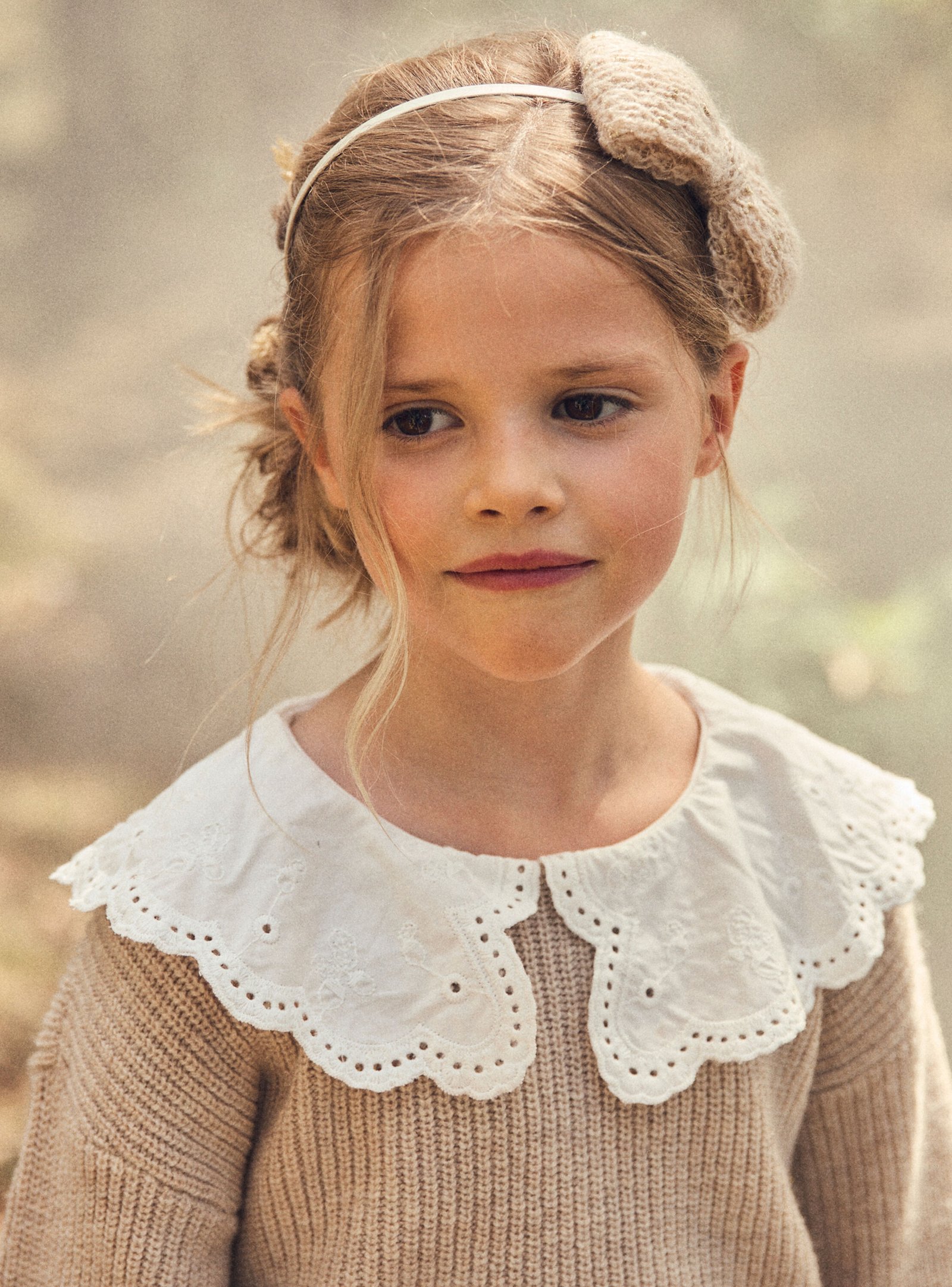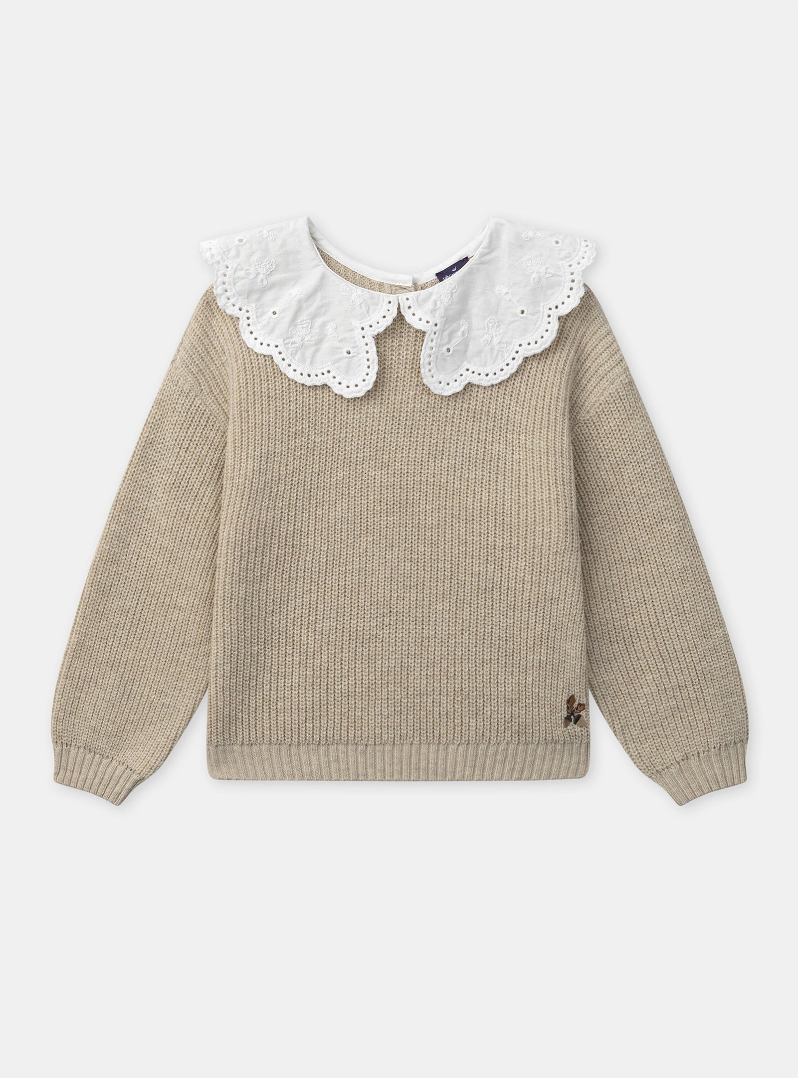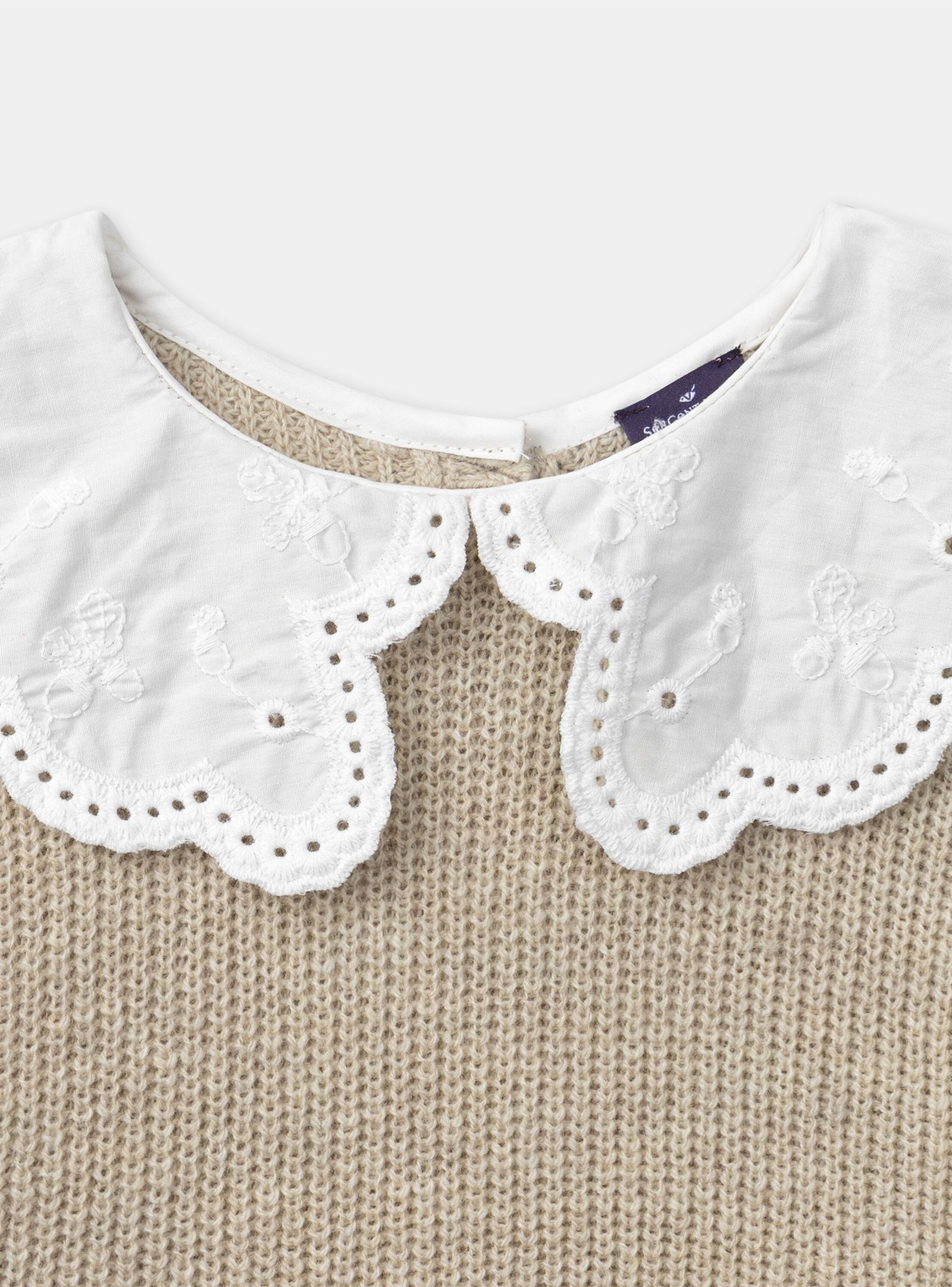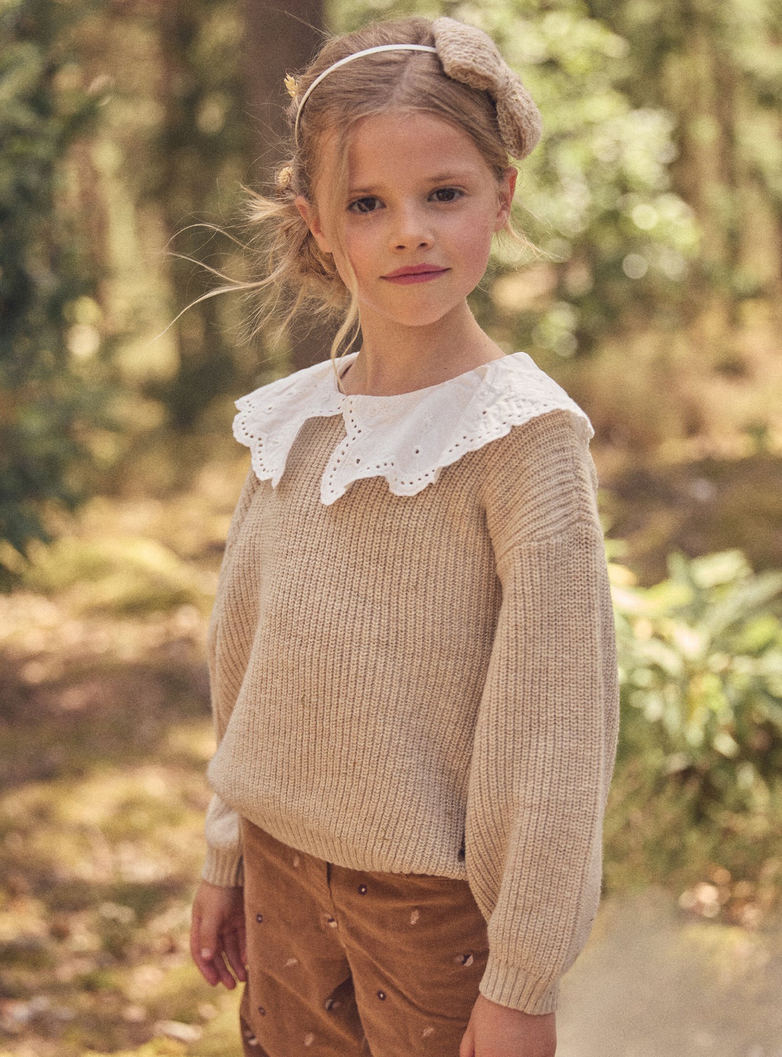 Perfect for little dreamers in cold weather, this knitted sweater combines comfort and elegance. Knitted in pearl ribs, it stands out with its lace Peter Pan collar. The embroidery of acorns and oak leaves delicately evokes autumn nature.