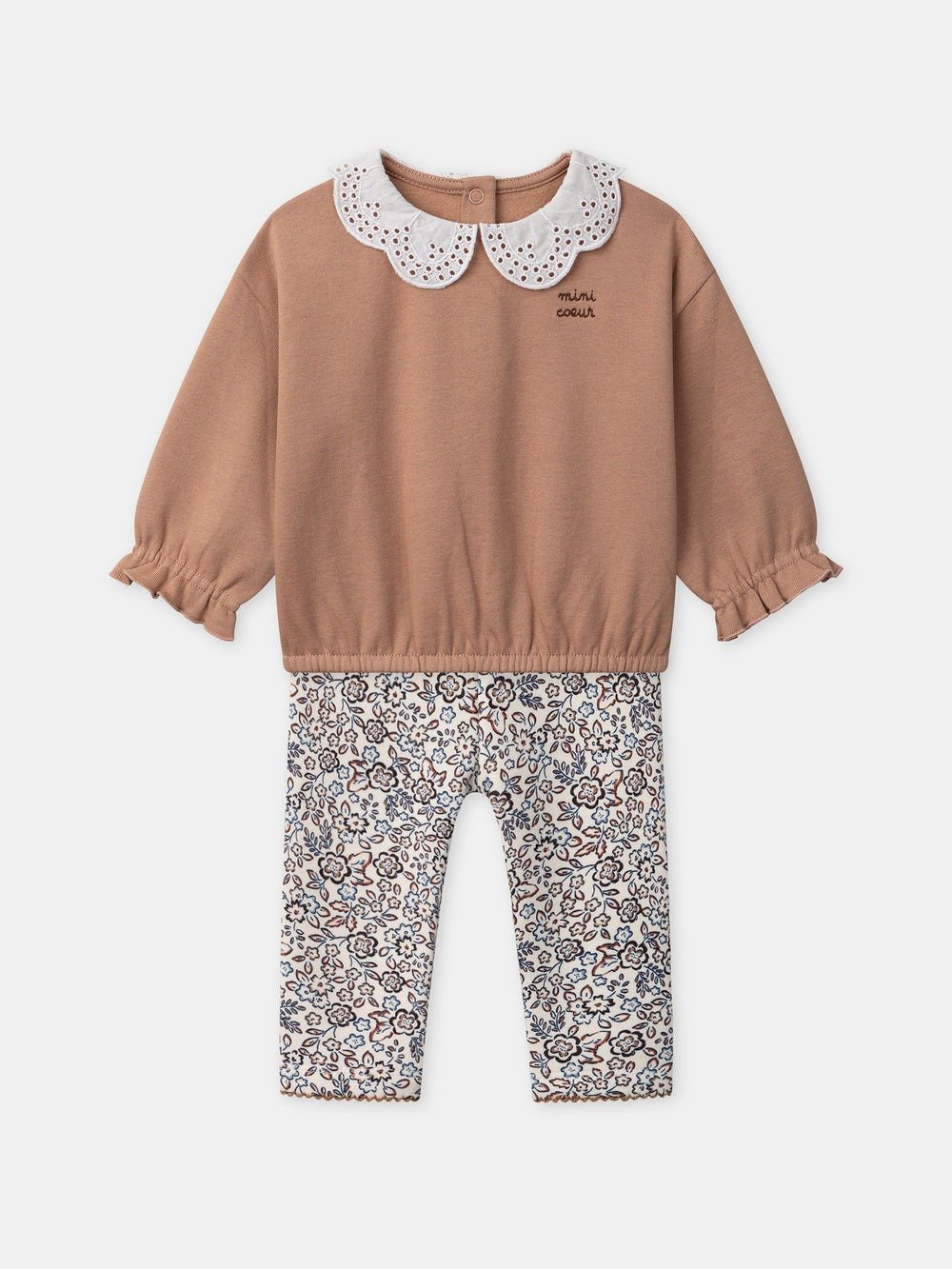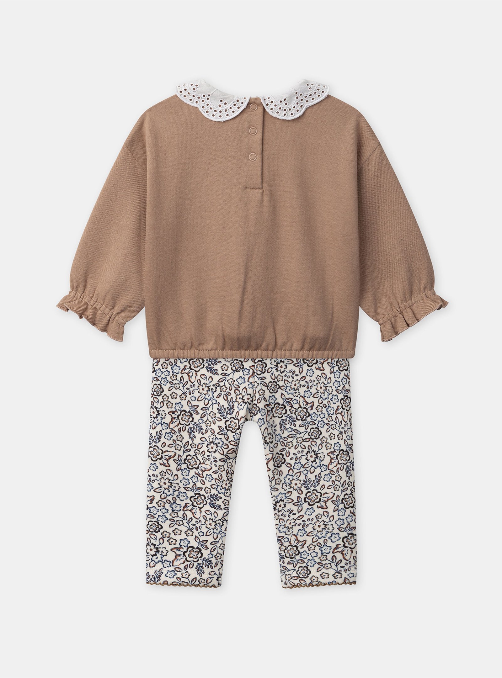 For curious and active children, this set offers comfort and style in mid-season. The light brown sweatshirt with embroidered Claudine collar and floral leggings are soft and practical. The back opening of the sweatshirt and the elastic waistband of the leggings make dressing easier.