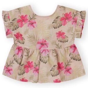 Girl’s dress, short sleeves with ruffle, V-neck. Back closure with 3 buttons. Gathered seam at waist to give flight. Decorative cord finished in tassels. Striped design, with interior lining. 100% cotton.