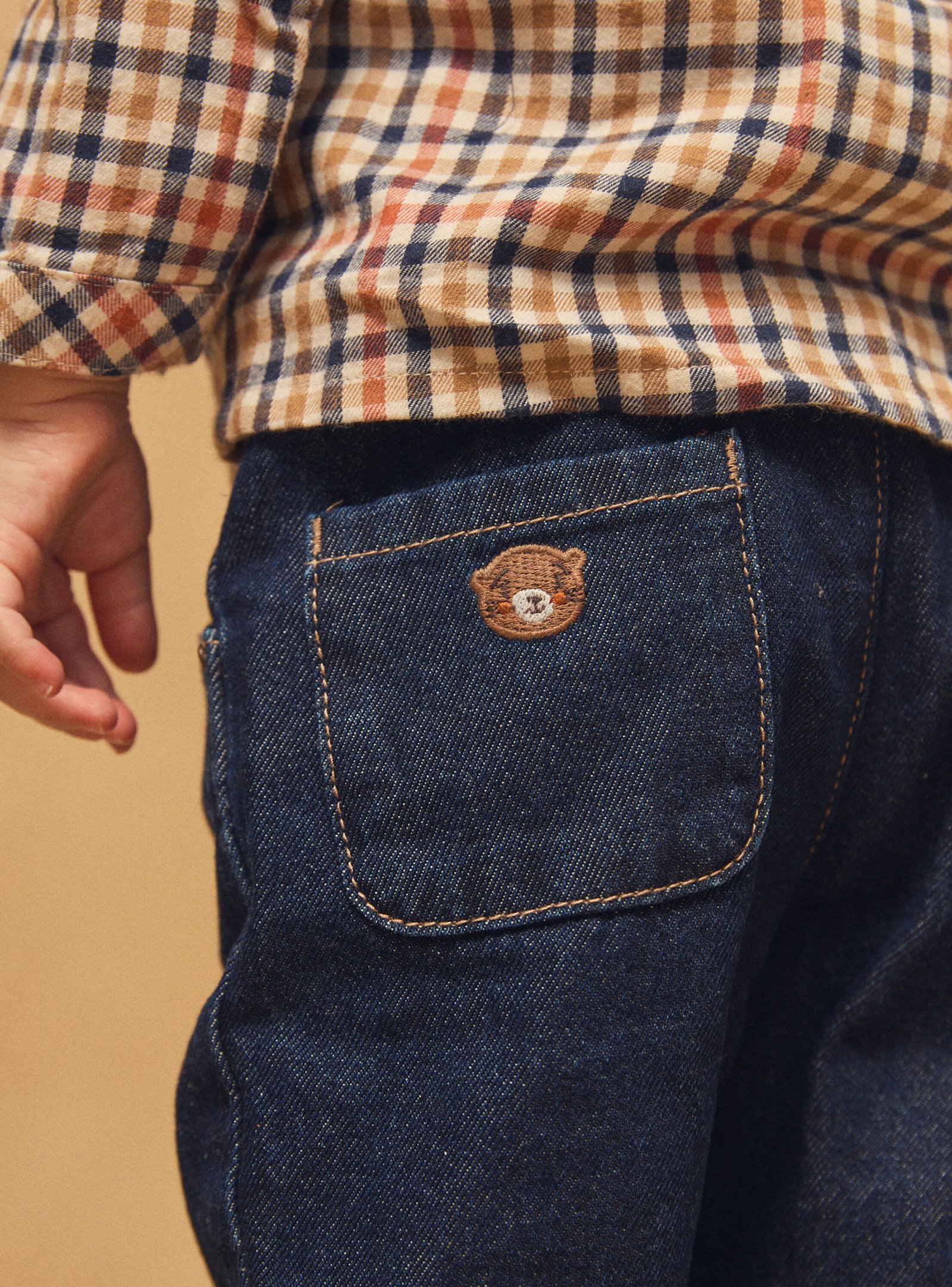 For active and stylish children, this navy blue, dark orange, and light brown checked shirt is easy to wear. Its patch pockets with embroidered animal faces add a playful touch. The full opening with classic buttons and snaps makes dressing easy.