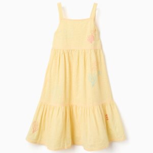 Prepare your girl for Summer days with this light beige dual-fabric dress. Made from soft fabrics, it features a knitted top with colourful crochet flowers, and a cotton skirt.