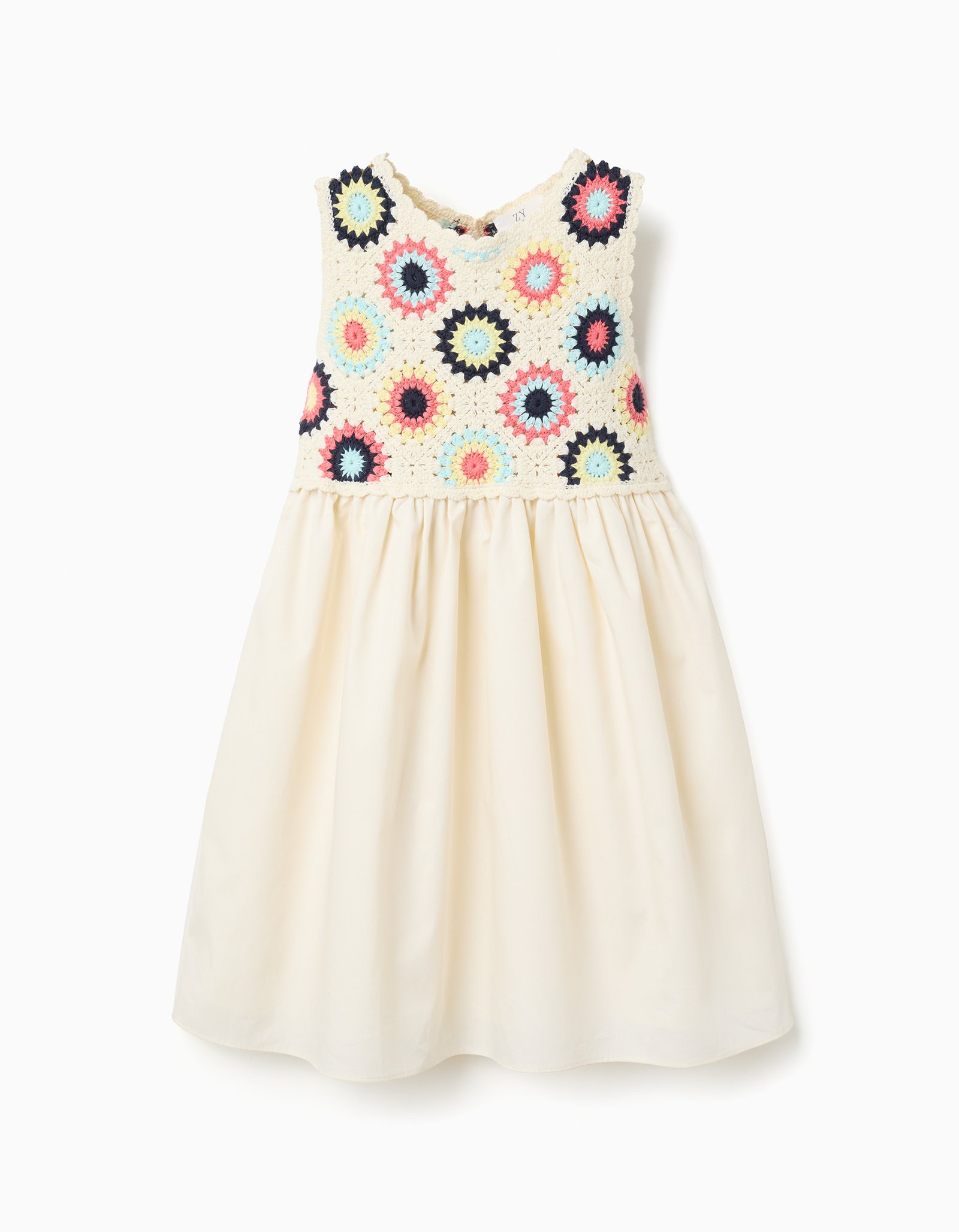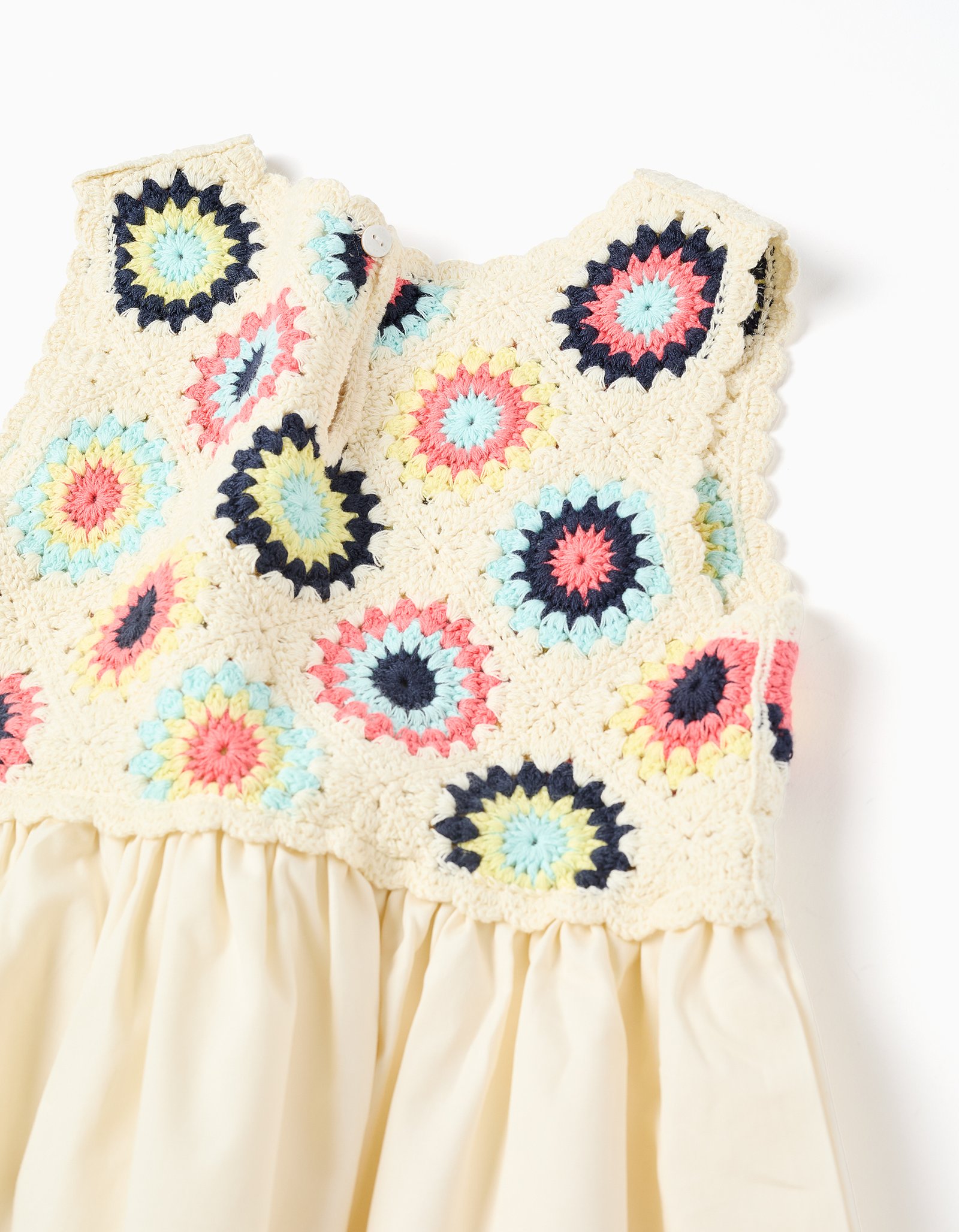 Prepare your girl for Summer days with this light beige dual-fabric dress. Made from soft fabrics, it features a knitted top with colourful crochet flowers, and a cotton skirt.