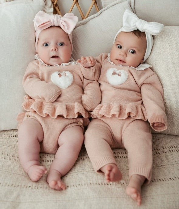 Pex Girls ‘Cecily’ suit features a soft pink knitted top and trousers,with a crisp white collar and a white heart on the front. Designed for comfort and style, this outfit is perfect for any occasion.