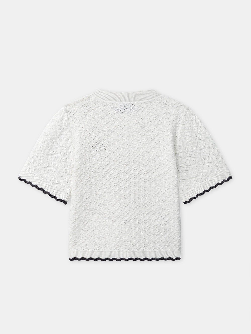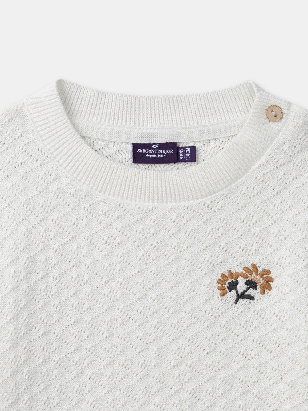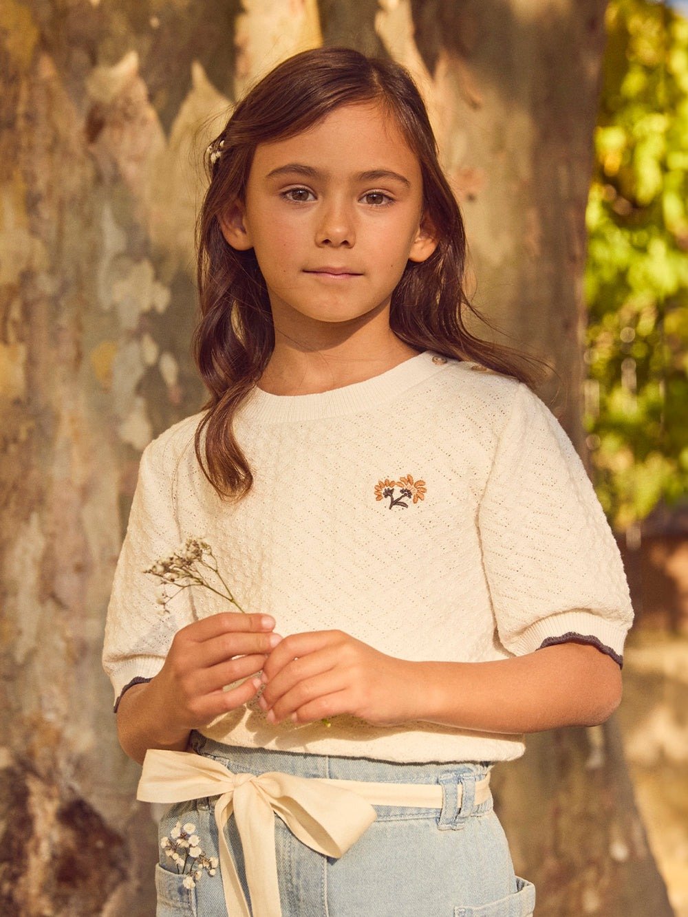 Designed for children who like to stay active while looking elegant on spring days. Its soft ecru knit ensures a comfortable drape. The floral embroideries and contrasting scalloped finishes add a poetic touch.