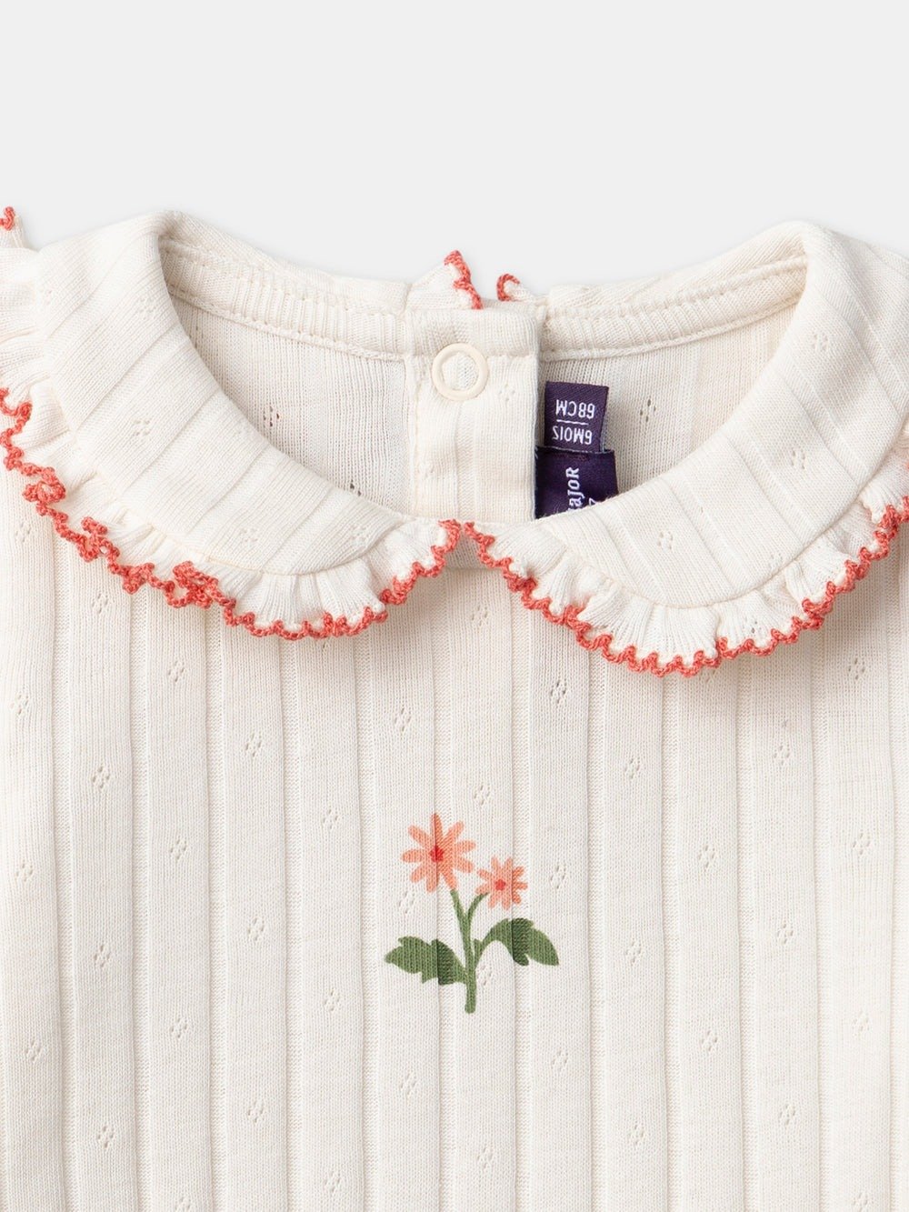 For toddlers sensitive to comfort, ideal for everyday wear. Ribbed cotton and snap-button openings make dressing easy. Small flowers add tenderness and softness.