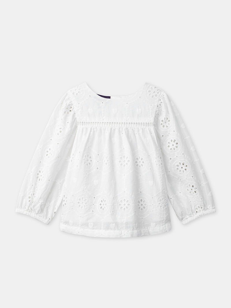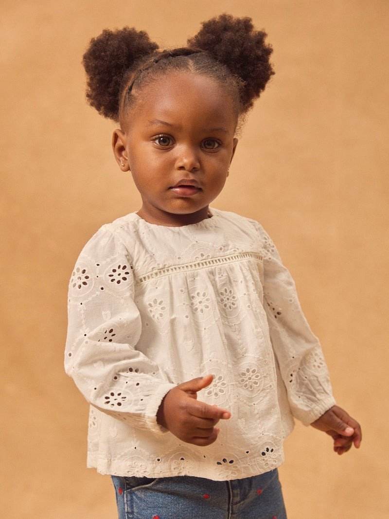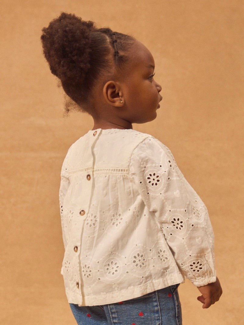 For adventurous girls in the spring, perfect for mild days. Ecru blouse made of lightweight cotton, loose fit for freedom of movement. Delicate embroideries and button opening at the back, tender and refined style.