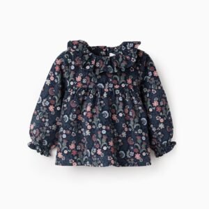 Dark blue corduroy blouse made of 100% cotton, with a multicolour floral pattern. Ruffled collar. Elasticated and wavy cuffs. Buttons at the back for easy dressing. A-line fit, wide and comfortable. An original design, matching the winter tones.