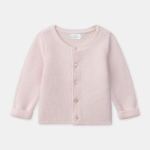 For little fashionistas, perfect for cool days. Cotton and wool mousse stitch cardigan with full front button opening. Soft pastel pink, tender and refined look to accompany her first explorations.