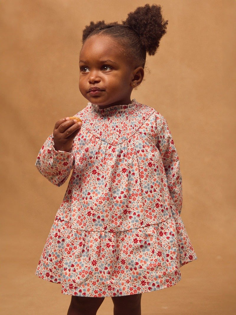 For lively and playful girls, ideal for spring. Lightweight dress with smocking and button opening at the back. Flower print and strawberries in red, blue, and coral, a fresh and cheerful style for any outing.