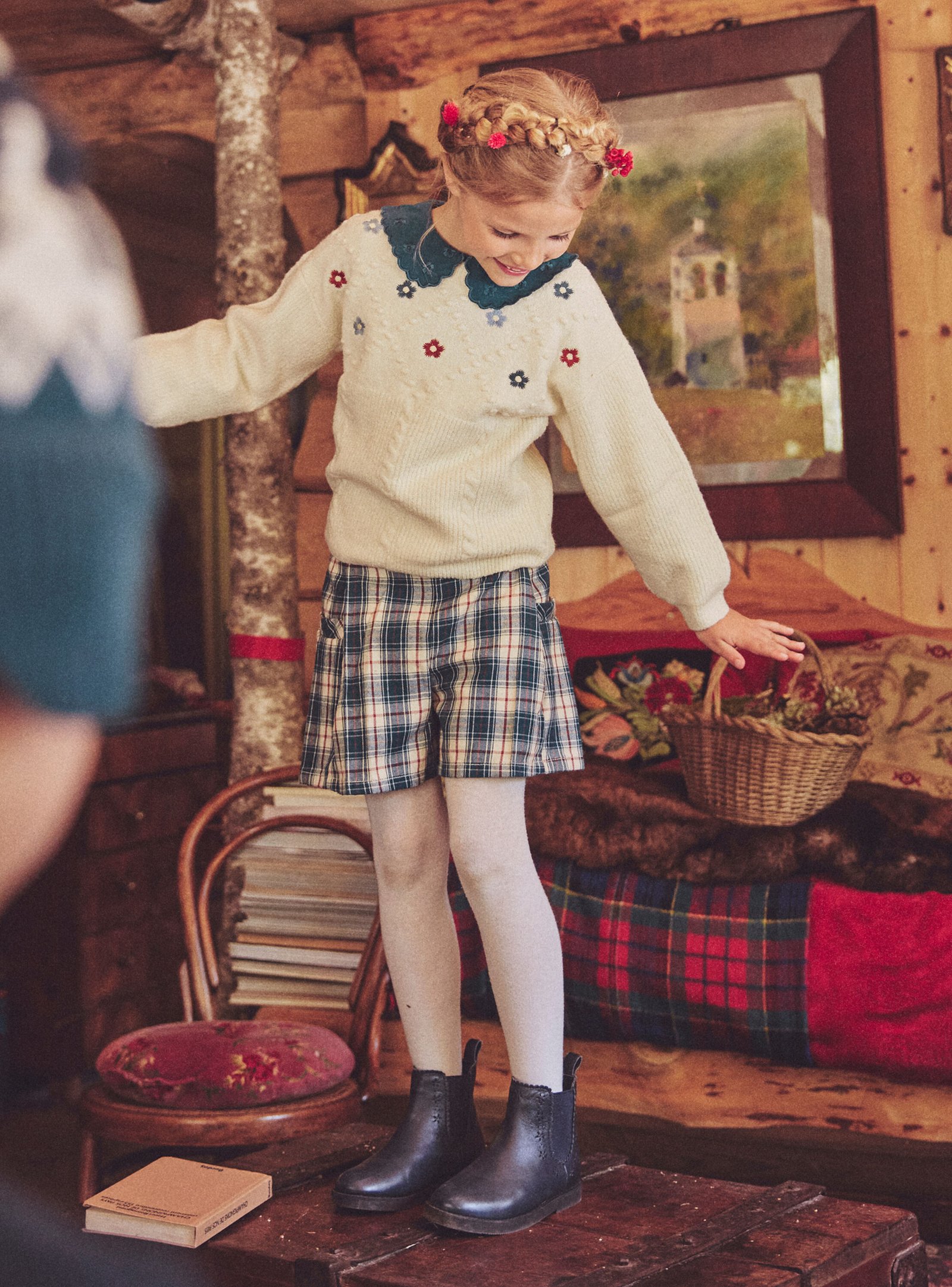 Designed for cool days, this sweater keeps children warm and cozy. Its soft knit features a play of stitches and braids. Floral embroidery and snug sleeves complete a delicate and timeless style. Super soft ecru sweater: