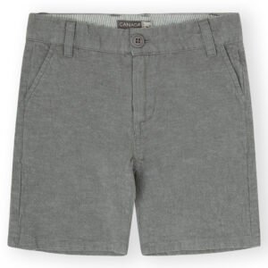 Baby boy shorts, in linen. Adjustable elastic waist, front button closure and belt loops. Side and back buttonhole pockets. Composition: 75% Cotton 25% Linen