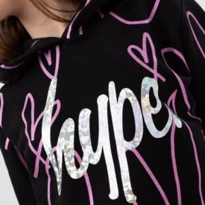 Designed in a 65% cotton 30% polyester black fabric blend for the ultimate amount of comfort. Featuring an all-over pink sketch heart repeat print and finished with a fitted hem and cuffs, kangaroo pouch, hood, and the HYPE. logo in silver foil script. Wear with the matching t-shirt and leggings to complete the look. Machine wash at 30 degrees.
