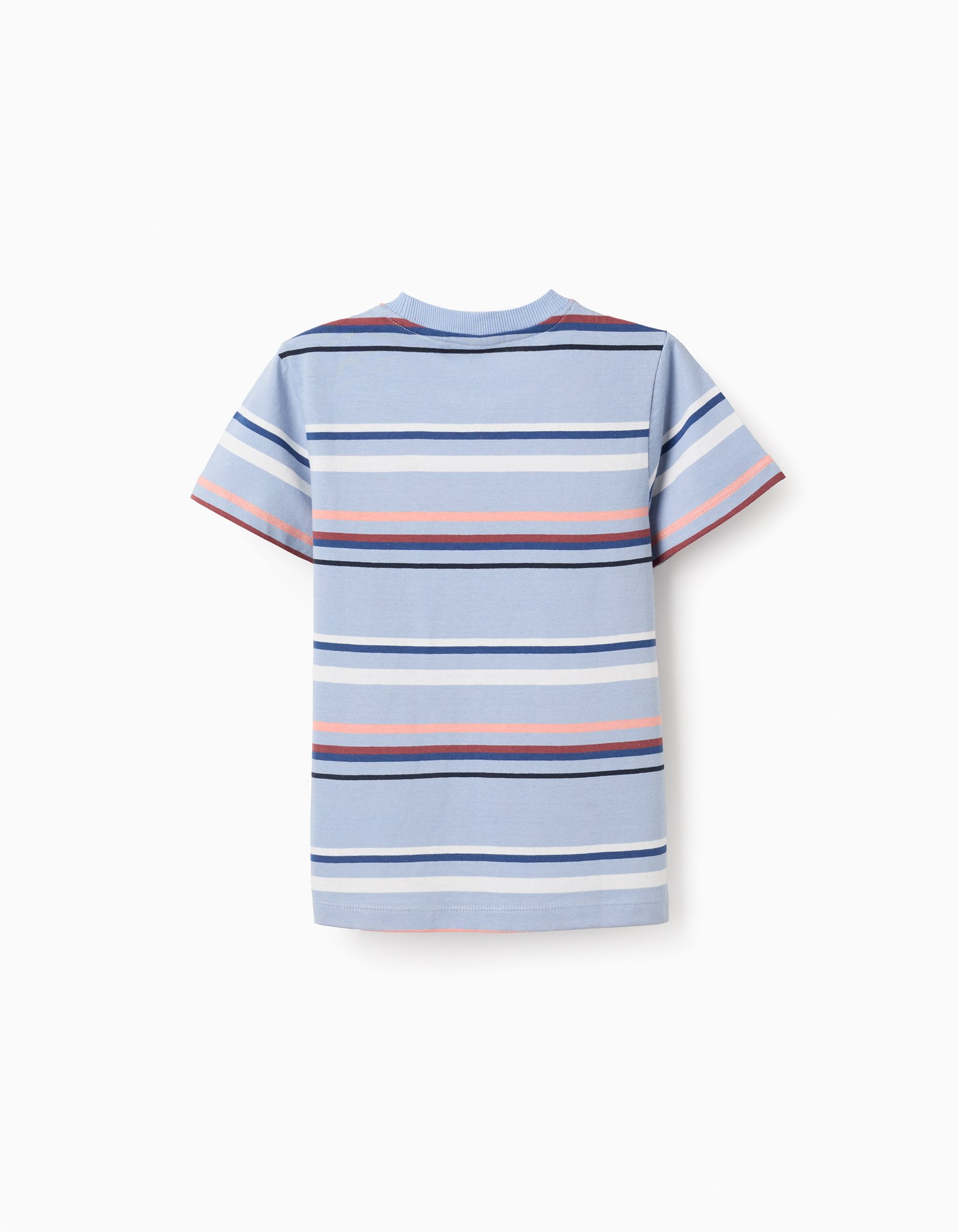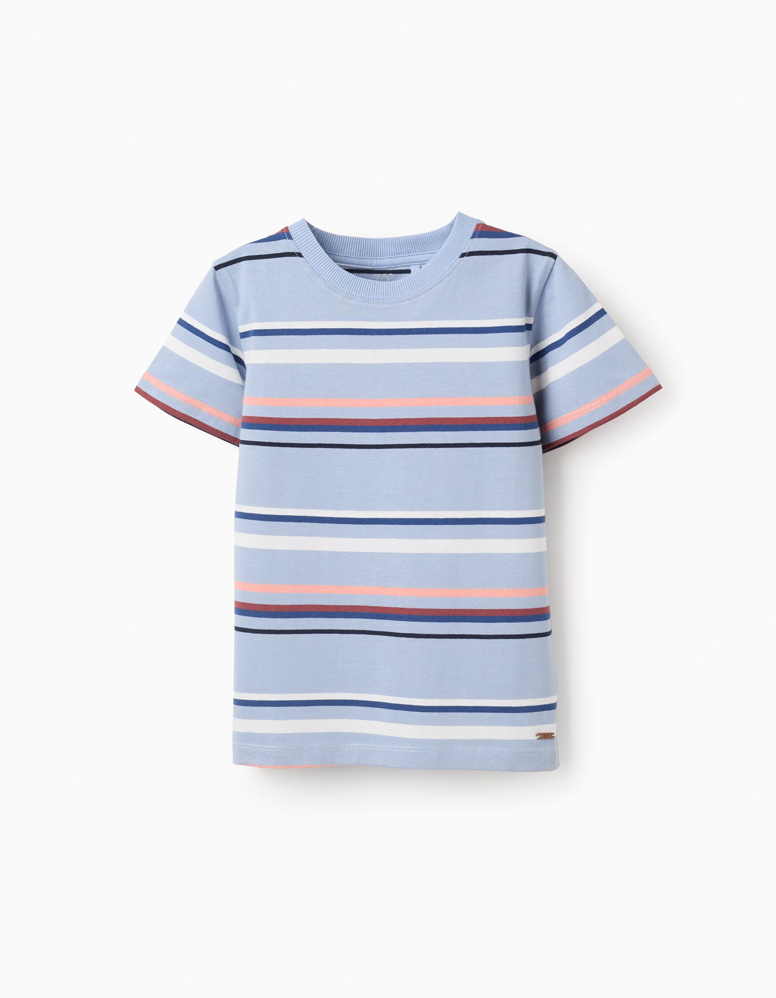 This light blue T-shirt is perfect for warmer days, providing a soft touch on your boy’s skin. This piece stands out with its dark blue, white, orange and brown stripes, which add an original touch. It is a practical choice for family outings or going to school, easily pairing with a variety of trousers and shorts.