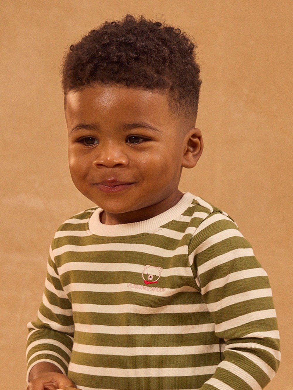 For a cheerful child, perfect for spring. The jersey and buttoned collar structure the silhouette. The teddy bear prints add a playful touch.