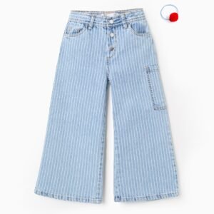 Girl's blue jeans, wide leg, with white vertical stripes. Six pockets, one of which is a cargo pocket. Fastens with three silver press studs. Includes an hair bobble with a red pompom to use as a prop!