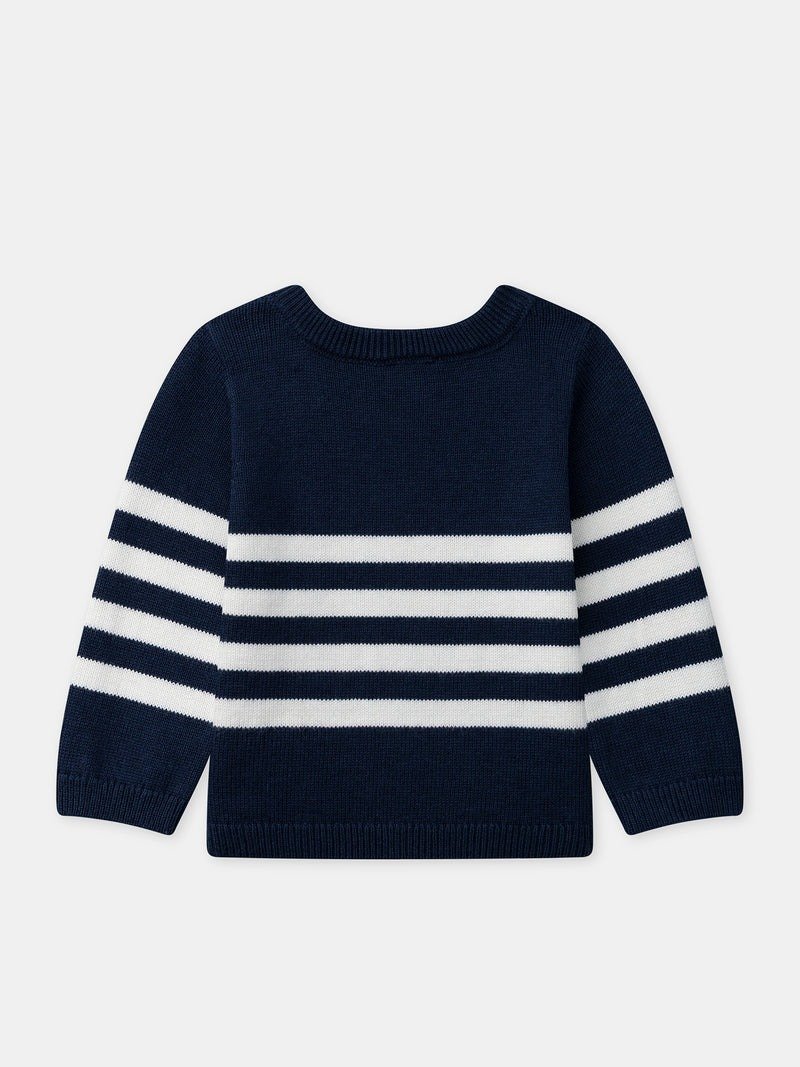 Soft cotton sweater with button opening at the collar. Navy stripes and dog embroidery on the chest, classic and fun style.