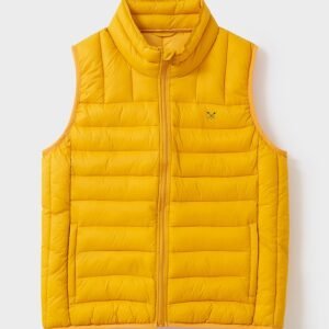 Our lightweight padded gilet in yellow. This style is made from recycled nylon and features a soft padded design, two roomy pockets and our crossed oars embroidered on the chest. • Shell: 100% recycled nylon • Lining: 100% polyester • Wadding: 100% polyester • Two pockets • Branded zip pull • Crossed oars embroidered on the chest • Machine wash at 30 degrees