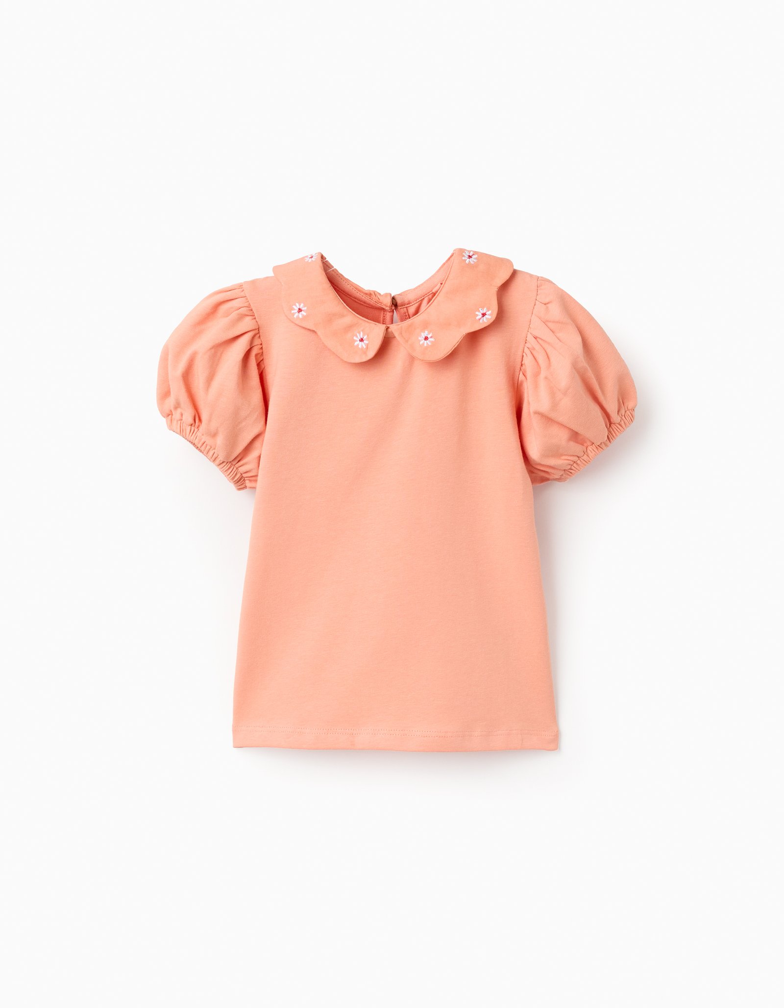 This salmon orange T-shirt is perfect for your baby girl’s Summer adventures. Made from cotton, it stands out for the delicate embroidered flowers on the collar.