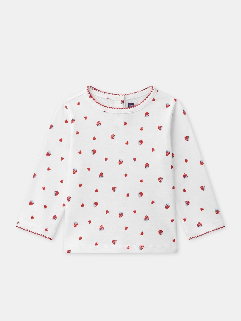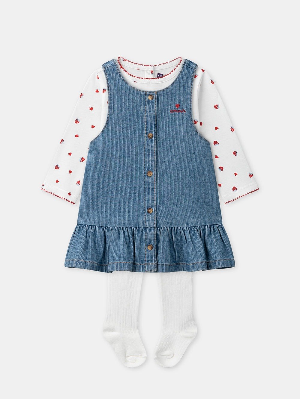 For curious and cheerful girls, ideal for spring. T-shirt, pinafore, and tights made of soft cotton with a practical opening to make dressing easier. Strawberry and heart patterns, red embroidery, and a charming coordinated style.