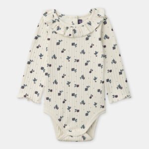 Ideal for babies in winter, this bodysuit fits everyday outfits. Made of ribbed jersey, it remains soft and comfortable. Its floral print and ruffle collar add charm and delicacy.