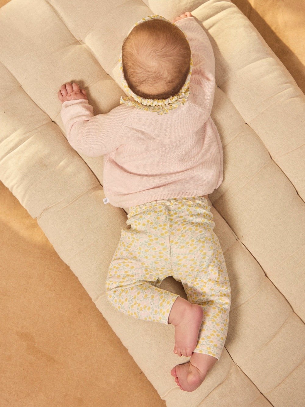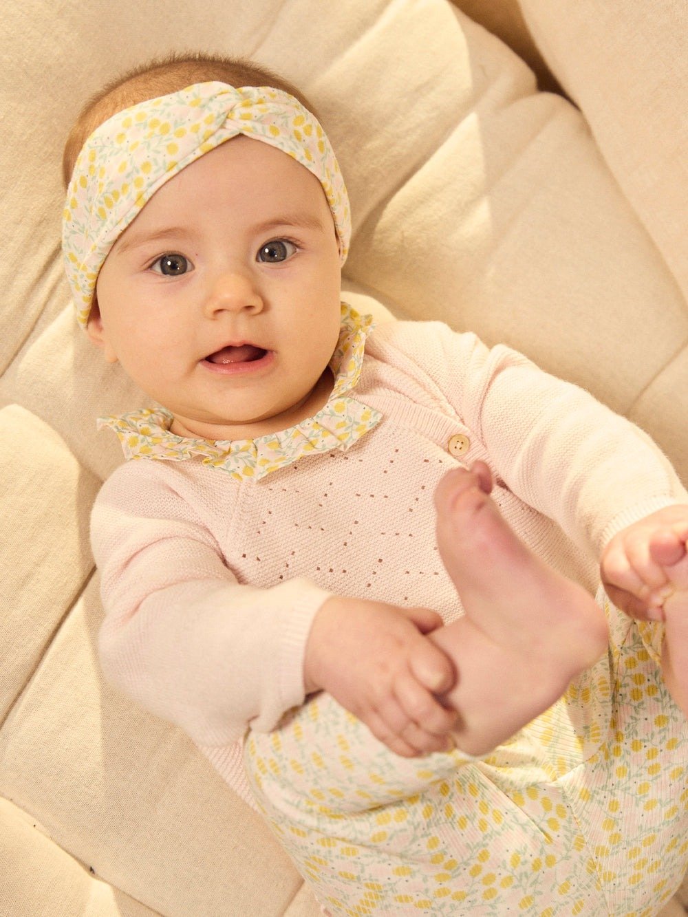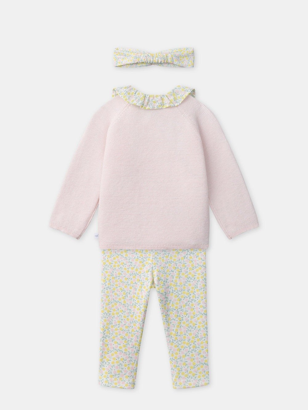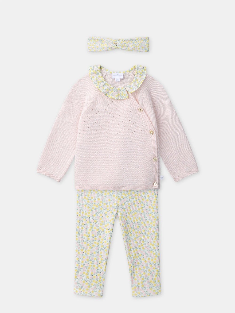 For the little spring fashionistas. Knit sweater and ribbed leggings, crossover opening with buttons. Floral prints and matching headband, poetic and tender universe.