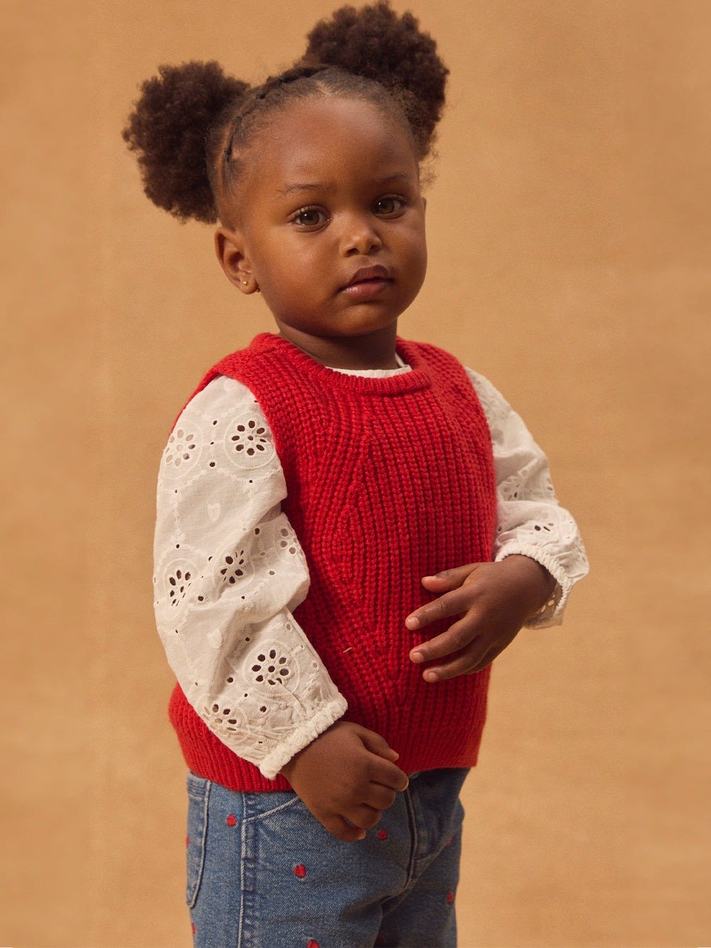 For energetic little girls, perfect for spring. Soft denim jeans with elastic waist for optimal comfort. Red heart embroidery, relaxed and charming style for all adventures.
