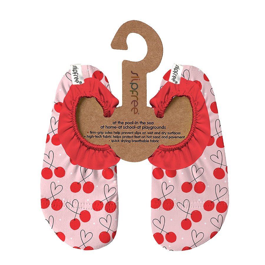 Tiny red cherries with heart-shaped stems dance across a soft pink background on Grace, creating a playful pattern at every step. With a super cute red ankle frill, little ones can hop, twirl, and skip in joy as they embark on their adventures.