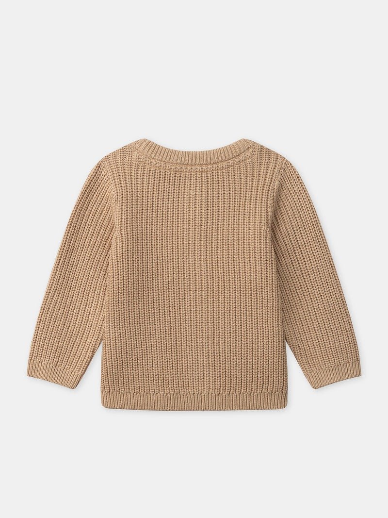 Soft cotton sweater with button opening at the collar. Navy stripes and dog embroidery on the chest, classic and fun style.