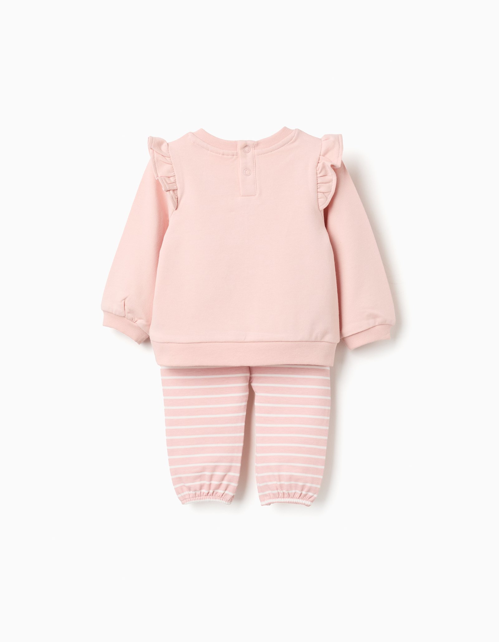 Discover this comfortable light pink Disney set, perfect for your newborn girl. It includes a sweatshirt with a fun front print of Winnie the Pooh. It also includes a pair of white and pink striped trousers.