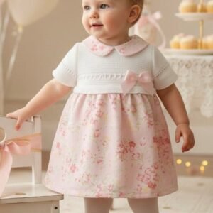 Ultra pretty baby girls dress. The top is softly knitted in white with a ribbon and bow detail towards the hem and a classic peter pan style collar in a lovely pink floral woven fabric. With a matching coordinating floral print skirt.