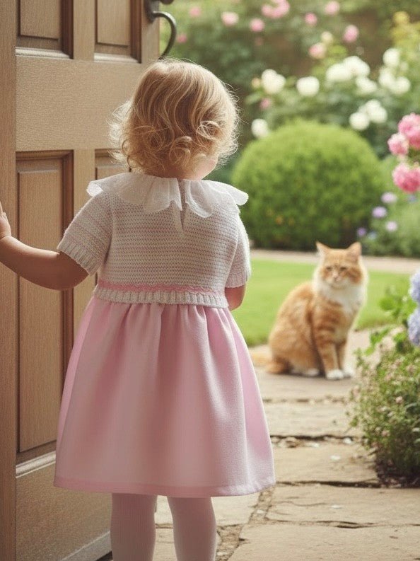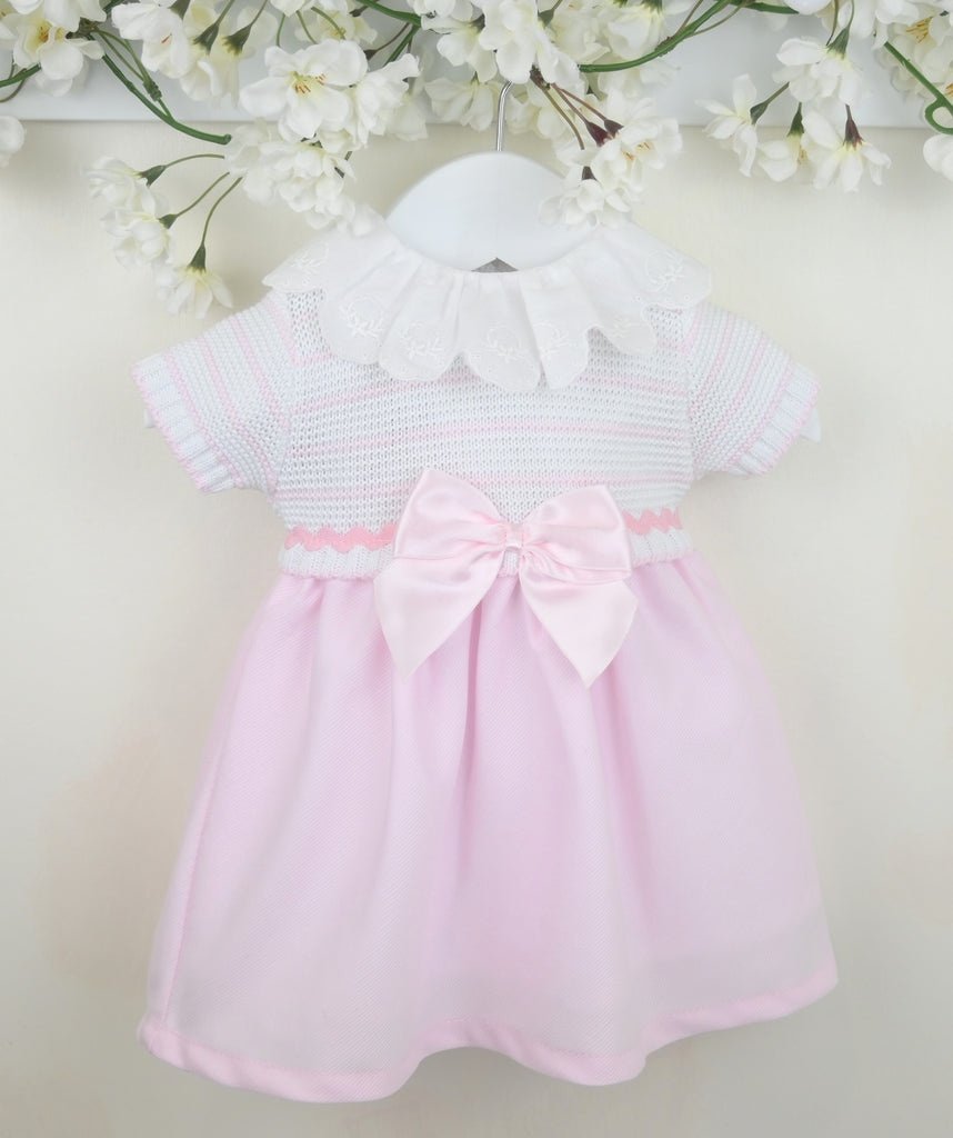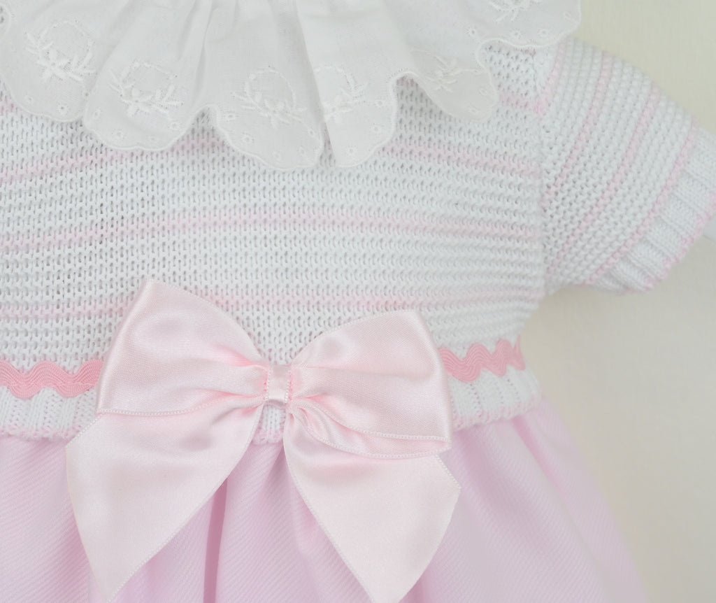 Stunning Spring/Summer dress. It has a softly knitted bodice in white cotton with delicate pink stripes. With an ornate lace collar and lovely ribbon bow to the waist. The skirt is woven pink cotton.