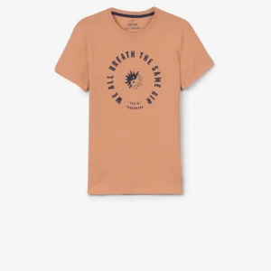 Round neckline T-shirt with short sleeves and pleated finish. Printed text on the front. Fabric appliqué detail.