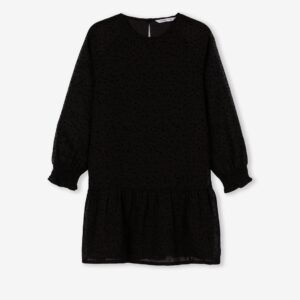 Dress with round neckline and long sleeves with elastic. Gathered cut detail. Back button fastening.
