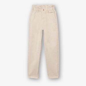 High-waisted paperbag jeans with elastic waistband. Side and back pockets. Front closure with zip and metal button.