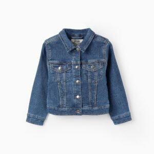 Blue denim jacket for girls, made from a soft and comfortable cotton blend. Chest pockets. Fastens easily with snaps. Inner label for the child's name.